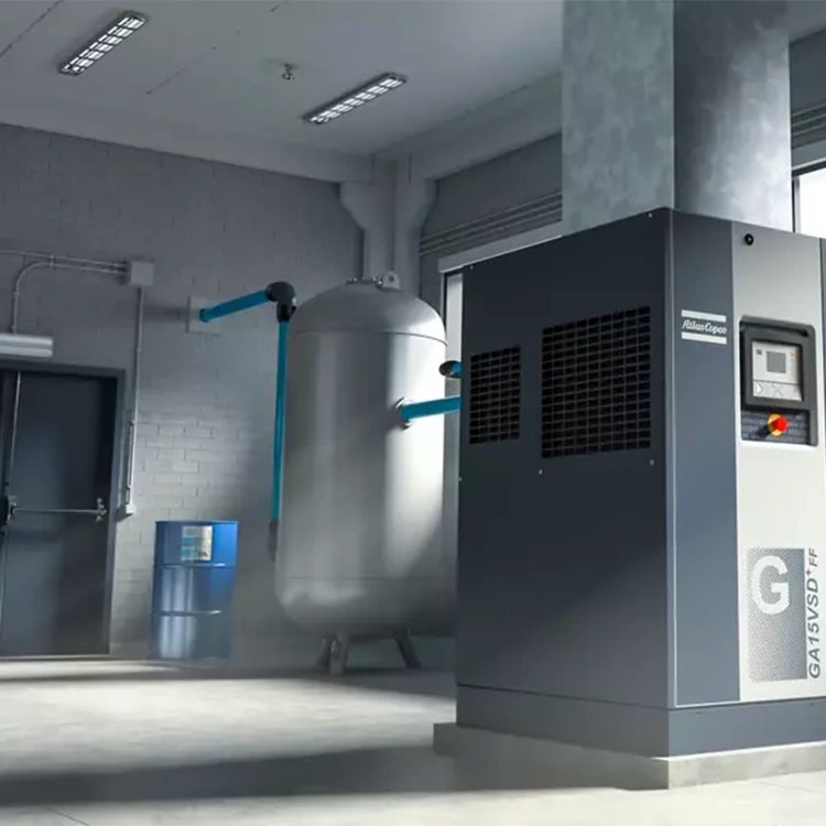 کچھ ایئر کمپریسرز "ٹینک ماونٹڈ" ہوتے ہیں ، جس کا مطلب ہے کہ وہ ایک مکمل یونٹ کے طور پر فراہم کیے جاتے ہیں اور ایئر وصول کرنے والے ٹینک کے اوپر انسٹال ہوتے ہیں۔ ٹینک قسم کے ایئر کمپریسرز کا استعمال نہ صرف جگہ کی بچت کرتا ہے بلکہ انفرادی ڈرائر کی تنصیب کے لئے درکار ابتدائی تنصیب کی لاگت کو بھی کم کرتا ہے۔ یہ ترتیب چھوٹے ہوا کے کمپریسرز میں بہت عام ہے ، اور آؤٹ پٹ پاور عام طور پر 26 کلو واٹ (یا 35 ہارس پاور) سے زیادہ نہیں ہوتی ہے۔ ٹینک کی تنصیب کے ڈیزائن کے ل large بڑے ایئر کمپریسرز موزوں نہیں ہیں کیونکہ اس کے نتیجے میں اعلی بھاری سیٹ اپ ہوگا ، جس سے ممکنہ طور پر حفاظت کے خطرات پیدا ہوں گے۔