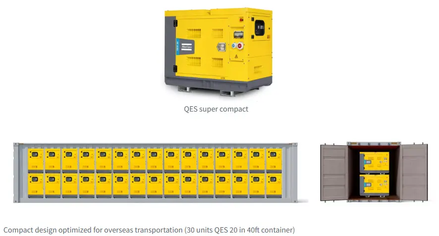 جدید سپر کومپیکٹ QES ماڈل انتہائی موثر نقل و حمل کی فراہمی کے لئے ڈیزائن کیا گیا ہے۔ آپ 40 فٹ کے کنٹینر میں اٹلس کوپکو QES 20 کے 30 یونٹ تک فٹ ہوسکتے ہیں ، جو مارکیٹ میں 20KVA پاور اٹلس جنریٹر کے لئے سب سے زیادہ ہے! اس کا مطلب ہے بہتر نقل و حمل ، CO2 کے اخراج اور آپریشنل اخراجات میں کمی ، جس کے نتیجے میں ملکیت کی کم لاگت (ٹی سی او) ہوتی ہے۔ اس کا ماحول دوست ڈیزائن اسے بیرون ملک مقیم اسٹوریج کے لئے مثالی بناتا ہے ، جس سے آپ کے مقام پر تیزی سے آپ کے نقش کو کم کیا جاتا ہے۔
