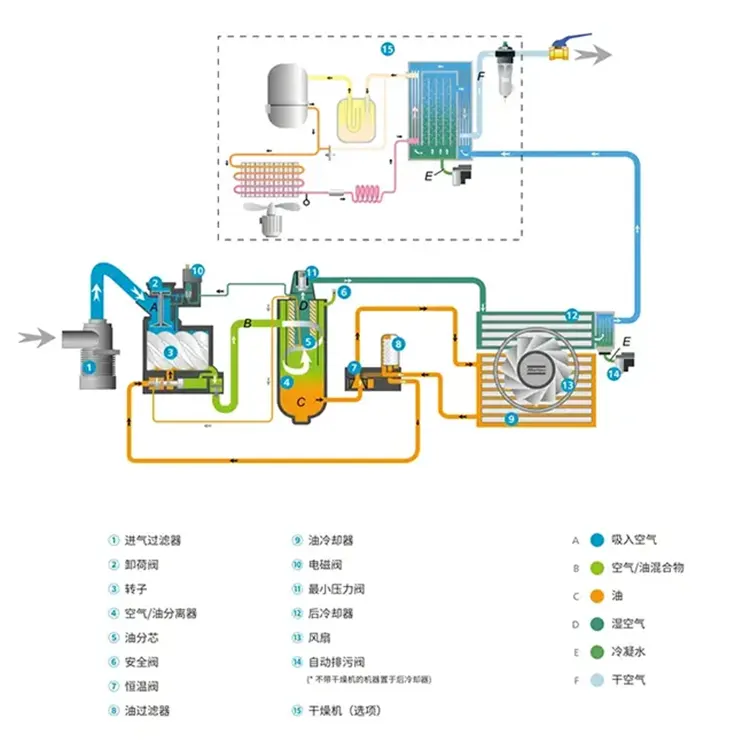 2. کمپریشن اسٹیج: جیسے ہی سکرو روٹر گھومتا ہے ، مرکزی یونٹ کے اندر ہوا کو کمپریشن فورس کا نشانہ بنایا جاتا ہے ، اور دباؤ آہستہ آہستہ بڑھتا ہے۔ اس مقام پر ، کمپریسڈ گیس کو پیچھے بہنے سے روکنے کے لئے راستہ والو بند ہے۔