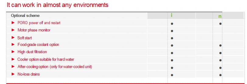 ہمارے کمپریسرز فوڈ گریڈ کولینٹ ، ہائی ڈسٹ فلٹریشن اور سخت پانی کے کولر اور سخت ماحول کے مطابق ڈھالنے والے دیگر اختیارات پیش کرتے ہیں ، جو آپ کی متعدد درخواست کی ضروریات کو پورا کرسکتے ہیں۔